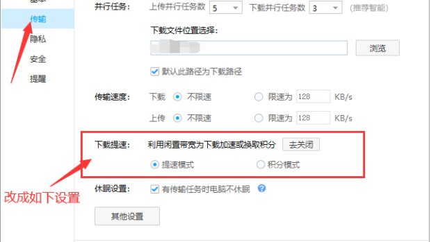 2.选择传输—-开启利用闲置带宽为下载加速