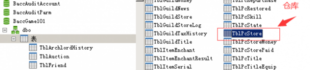 首先找到仓库所在位置,数据库BaccGame101里的表TblPcStore